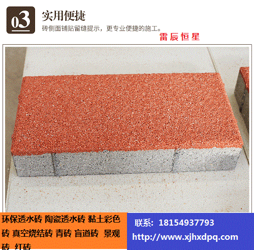 彩色透水磚:透水磚與傳統的彩色路面磚不同,它呈多孔、蜂窩狀結構,本身有自然積存、自然滲透、自然凈化功能。它能有效的解決城市熱島效應、除塵降噪,是海綿城市建設不可缺少的路面材料。聯系熱線18154927793李經理或者0991-6867420.